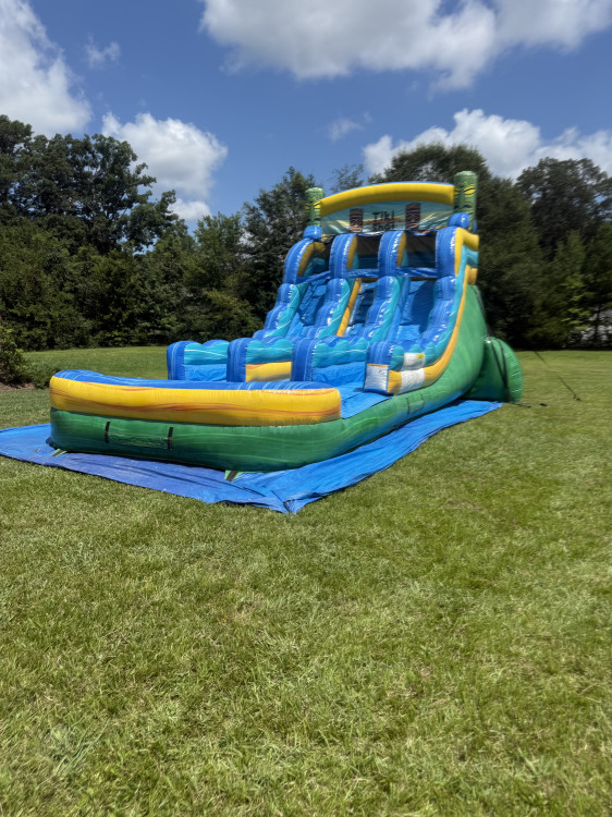 Get ready for the biggest thrill with the "The exhilarating Tiki Plunge " which is 15 feet into the air and features two lanes for a higher through put. Race side by side down the Super steep then down the slip and slide under a spray of water. The vibrant tropical colors will bring that tropical luau feel to your event and the theme is so universal and easy to pull together. This medium size inflatable water slide for is great for your community event, birthday party celebration, or family reunion and much more.